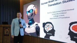 The conference also included a roundtable session featuring a distinguished group of specialists and researchers in the field of translation. Among them was Asst. Prof. Dr. Maher Sami Hassan, a faculty member from the Department of Translation, who presented valuable academic insights on the state of translation in higher education and its technical and linguistic challenges.