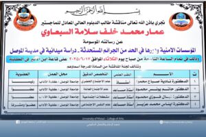 On Tuesday, June 17, 2025, the Department of Sociology at the College of Arts held a defense for a Higher Diploma thesis titled “Security Institutions and Their Role in Combating Emerging Crimes (A Field Study in Mosul City).” The session was attended by Dr. Firas Abbas Fadil, Head of the Department, and several faculty members.