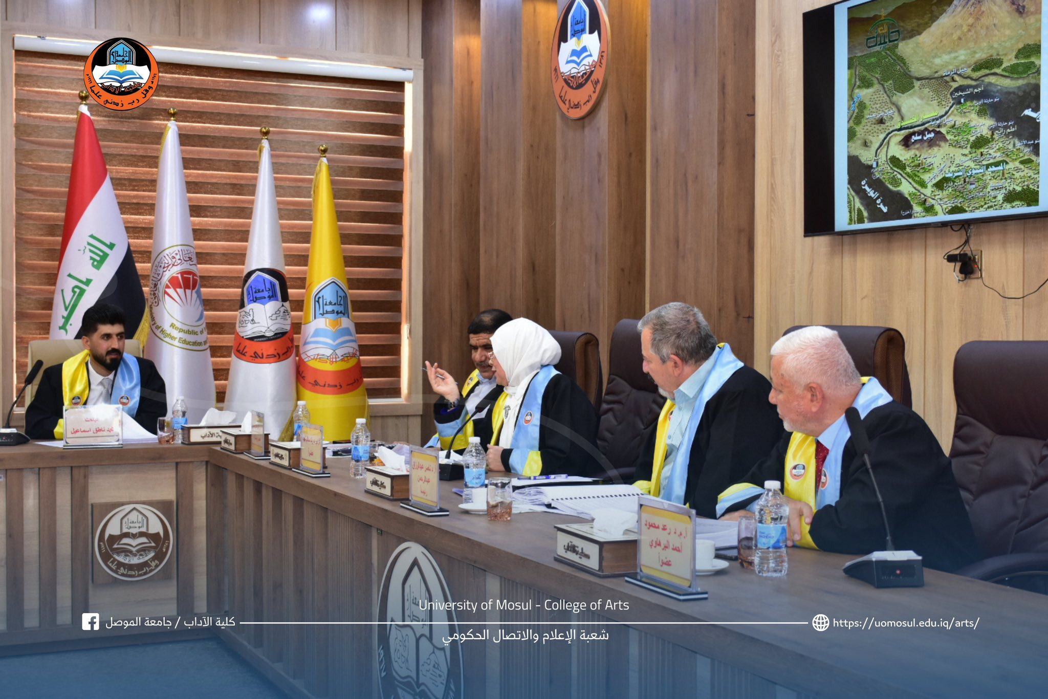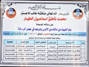 On Thursday, June 12, 2025, the Department of History at the College of Arts convened for the defense of a master’s thesis examining “The Banu al-Nabit ibn Malik ibn al-Aws and Their Role During the Prophetic Era.” The session was graced by the presence of Professor Dr. Hatem Fahd Al-Tai, Dean of the College, Dr. Mahmoud Salih Saeed, Head of the Department, and various esteemed faculty members.