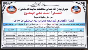 After extensive academic deliberations, the examination committee deemed it necessary to amend the dissertation’s title from “Polarity in the Poetry of Najm al-Din Ibn Sawar al-Dimashqi (d. 677 AH)” to “Artistic Manifestations in the Poetry of Najm al-Din Ibn Sawar al-Dimashqi (d. 677 AH).” This change was made to ensure the title is more comprehensive and consistent with the dissertation’s content and themes, accurately reflecting the critical and analytical approach adopted by the researcher.