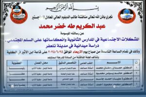 On Wednesday, June 25, 2025, the Department of Sociology at the College of Arts discussed a High Diploma thesis, equivalent to a master’s degree, titled “Social Problems in High Schools and Their Reflections on Community Peace: A Field Study in the City of Tal Afar.”