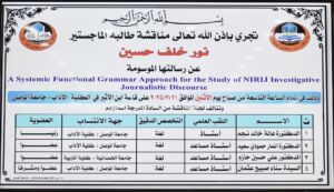 The study, presented by student Noor Khalaf Hussein, aims to analyze the linguistic structure of investigative journalistic discourse using Halliday’s Systemic Functional Grammar. It specifically focuses on the ideational function to analyze how language constructs meaning in investigative reports.