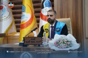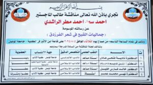 The Department of Arabic Language at the College of Arts discussed a master’s thesis on “The Aesthetics of Ugliness in the Poetry of Al-Farazdaq” on Tuesday, August 5, 2025. The Dean of the College, Professor Dr. Hatem Fahd Al-Tai, the Head of the Department, Dr. Ahmed Saleh Younis, and several college faculty members attended part of the discussion.