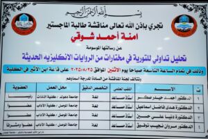 The Department of English at the College of Arts held a defense for a master’s thesis on Monday, August 25, 2025. The thesis is titled “A Pragmatic Analysis of Pun in Selected Modern English Novels.” A part of the defense was attended by the Dean of the College, Professor Dr. Hatem Fahd Al-Ta’i, the Head of the Department, Dr. Salih Abdullah Abdulrahman, and several faculty members.