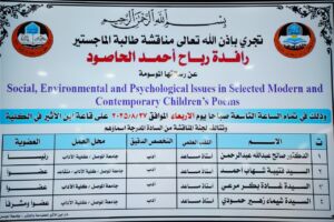 The Department of English Language at the College of Arts held a master’s thesis defense for a study titled “Social, Environmental and Psychological Issues in Selected Modern and Contemporary Children’s Poems” on Wednesday, August 27, 2025. The defense was attended by Professor Dr. Hatem Fahd Al-Taie, the Dean of the College, along with several faculty members.