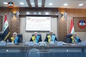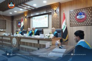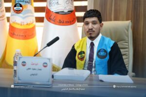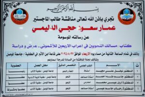 A thesis defense for “A Study of Al-Ashmouni’s Book: The Paths of Grammarians in the Grammatical Analysis of the Forty Hadith” was held by the Department of Arabic Language at the College of Arts on Wednesday, August 27, 2025. The defense was attended by the Dean of the College, Professor Dr. Hatem Fahd Al-Taie, the Head of the Department, Dr. Ahmed Saleh Younis, and a number of faculty members.