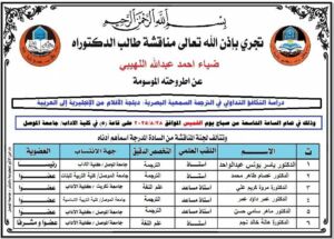 The Department of Translation at the College of Arts held a PhD dissertation defense on Thursday, August 28, 2025. The dissertation, titled “Investigating Pragmatic Equivalence of Audio-Visual Translation: Dubbing from English into Arabic,” was presented by student Dhiaa Ahmed Abdullah Hussein. The defense was attended by the Dean of the College, Professor Dr. Hatem Fahd Al-Taie, and several faculty members.