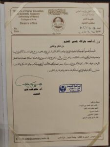 The Dean of the College of Arts, Professor Dr. Hatem Fahd Hano Al-Tai, has awarded a Letter of Thanks and Appreciation to Professor Dr. Ahmad Jarallah Yassin, a faculty member in the Department of Arabic Language, in recognition of his distinguished efforts in chairing the short story competition evaluation committees in Nineveh Governorate.