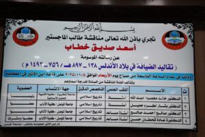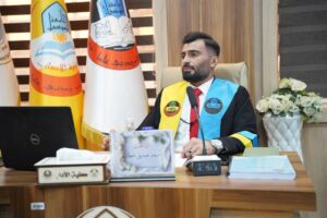 The Department of History at the College of Arts discussed a Master’s thesis titled “Hospitality Traditions in Al-Andalus (138-897 AH / 756-1492 CE)” on Wednesday, November 5, 2025. The Dean of the College, Professor Dr. Hatem Fahd Al-Ta’i, the Head of the Department, Dr. Salih Mahmoud Saeed, and a number of the College’s faculty members attended part of the defense.