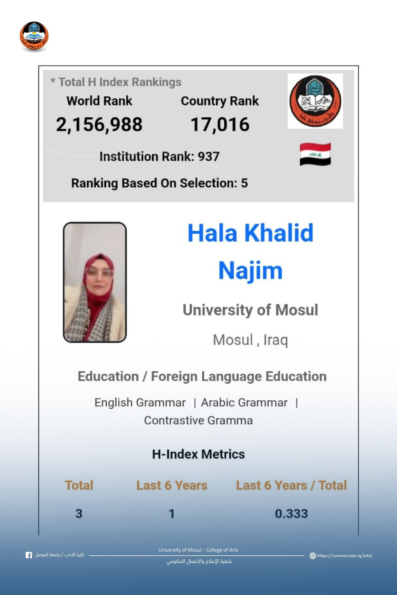 According to the 2025 scientific h-index classifications, Professor Dr. Hala Khalid Najm, Head of the Translation Department, and Assistant Professor Dr. Marwan Najib Tawfiq from the College of Arts have been selected among the top [Read More]