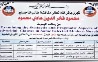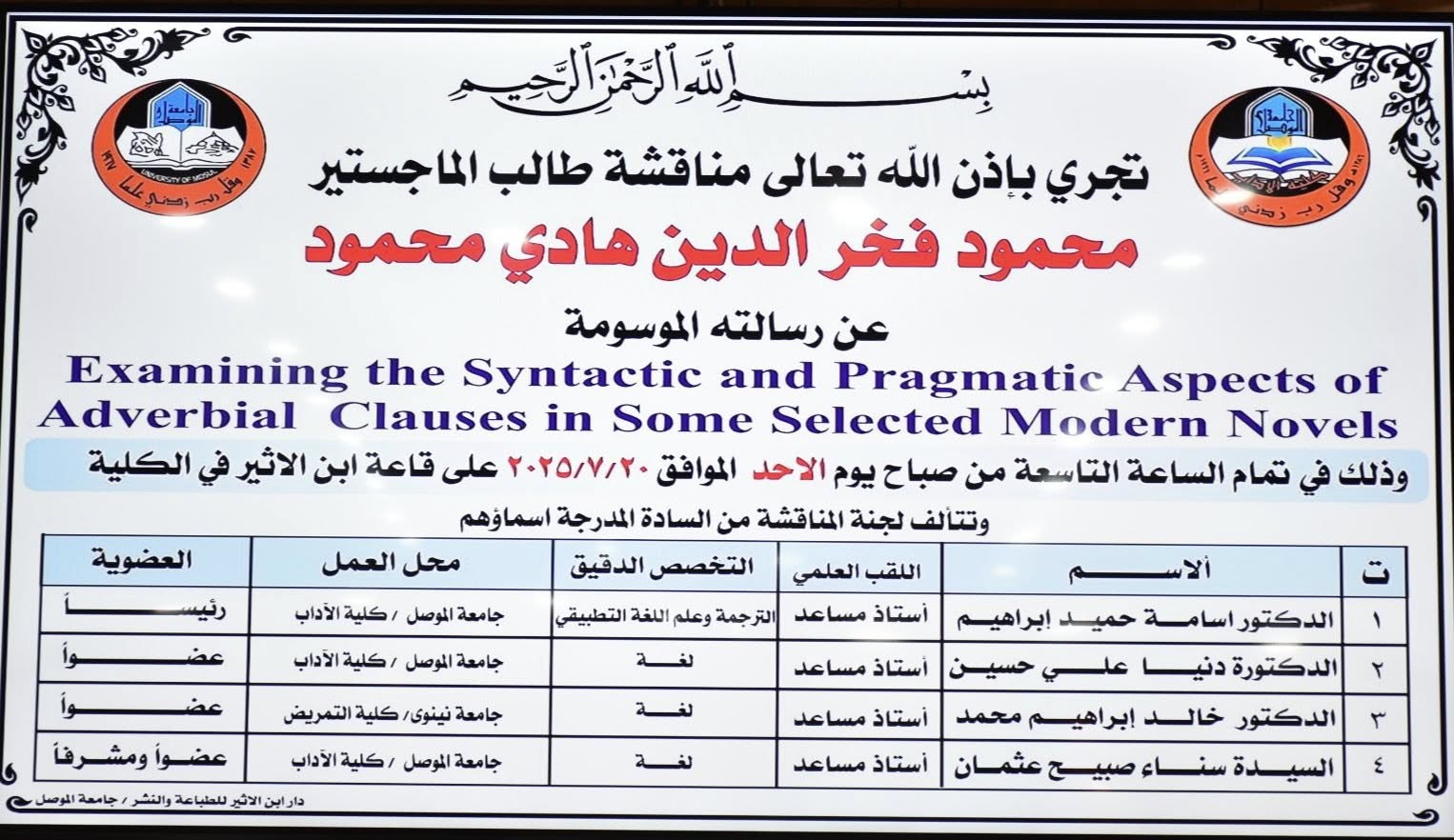 On Sunday, July 20, 2025, the English Language Department at the College of Arts held a master's thesis defense for a study titled "Examining the Syntactic and Pragmatic Aspects of Adverbial Clauses in Some Selected [Read More]