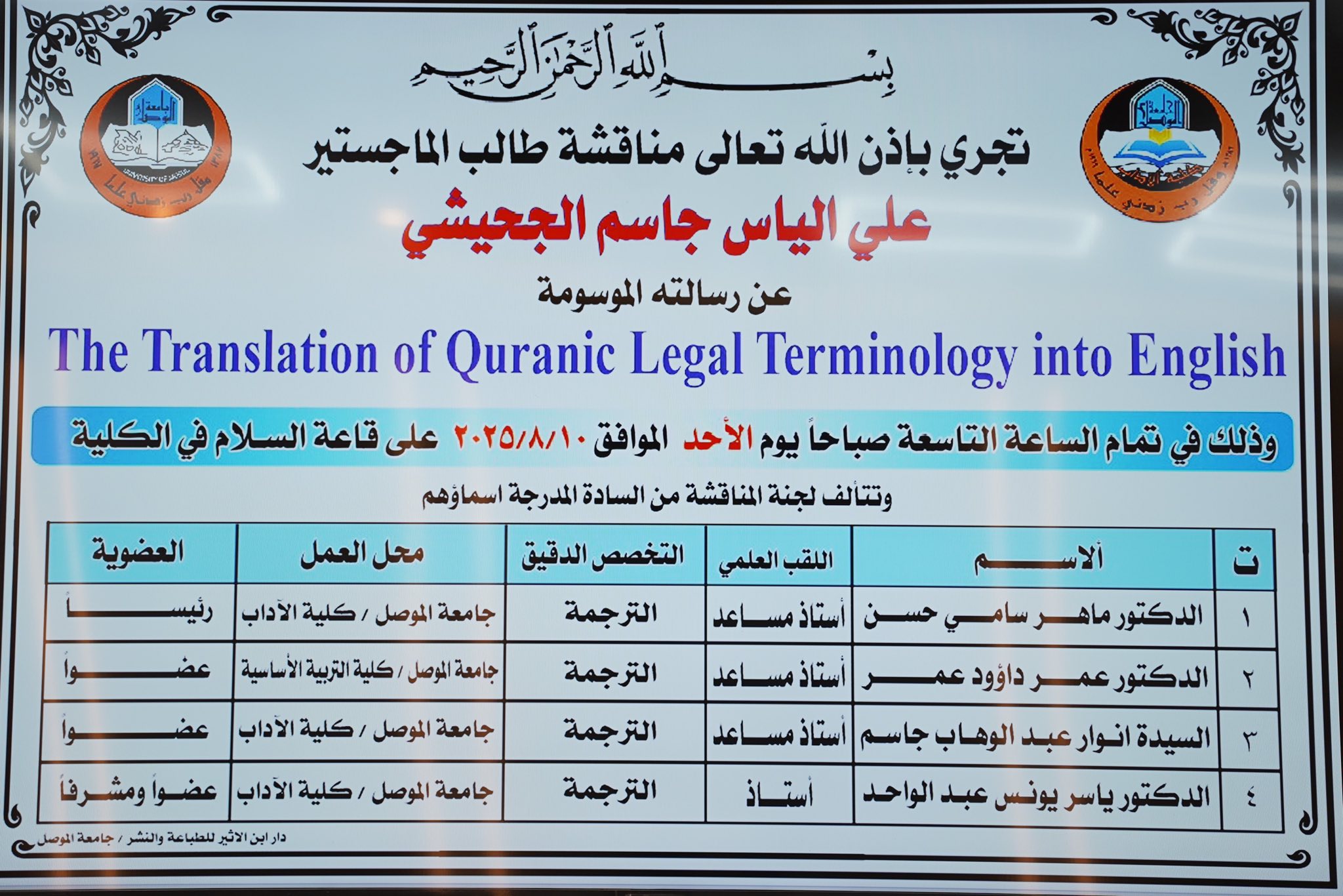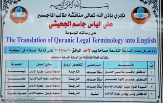 The Department of Translation in the College of Arts held a master's thesis defense on Sunday, August 10, 2025, for a study titled "The Translation of Qur'anic Legal Terminology into English." The event was [Read More]