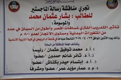 With the attendance of Assistant professor Dr. Safaaldeen Abdullah Sulaiman the dean , Prof . Dr . Qusai Hazim Mohammed head of physical education department and a number of basic education staff , a debate of M .A. Ed. Candidate Bashar Othman Mohammed Yosuf from physical education department took place for his thesis entitled (effect of periodical training for longer and shorter race phases on a number of body variables and continuum of achievement for 800m race ) 1. On Monday 22l4l2019 on Um Al-Rabeain hall in our college , the debate committee were 1-Professor Dr. Mohammed Tawfiq Othman head 2-Professor Dr. Thair Ghanim Hamdoon member 3-Professor Dr. Ibtisam Haider Baktash member 4-Lecturer Dr. Ammar Moyaed Omar member and supervisor