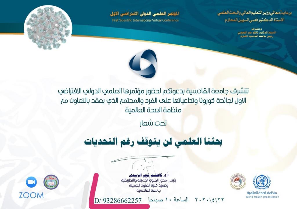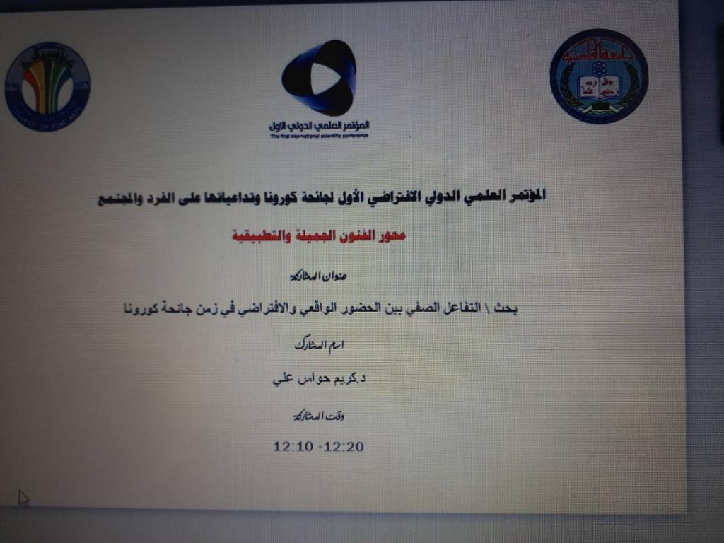 Under the slogan (Our scientific research will not stop despite the challenges), Prof. Dr. Saleh Ardeni, Dean of the College of Basic Education, participated on Wednesday, April 22/2020, the first hypothetical international scientific conference at the University of Qadisiyah. The tagline (Corona pandemic and its impact on the individual and society) is the focus of fine and applied arts .