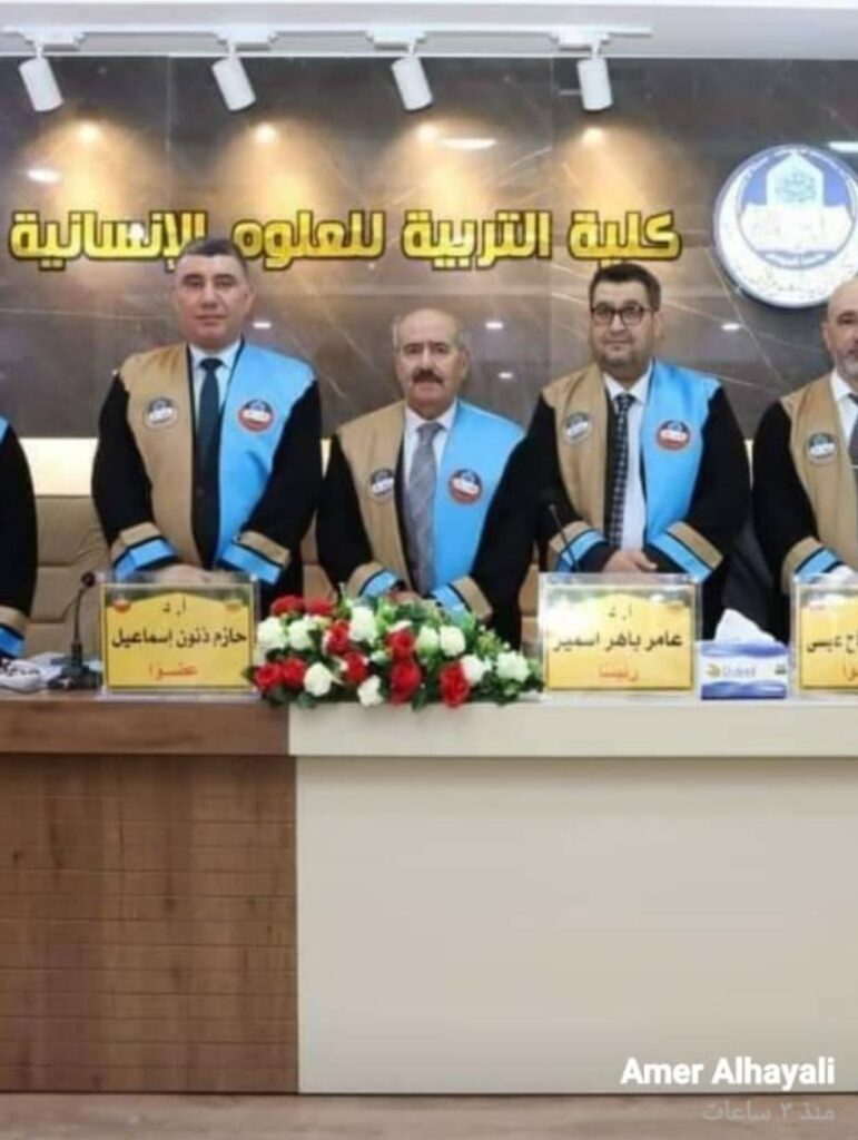 An M.A.Thesis in specialization of history was debated on umulrabeean hall / college of basic education / university of mosul on 19/9/2022 . dean and his two assistants attended part of the debate