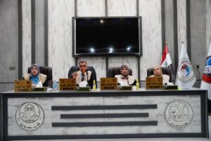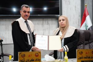The discussion committee was chaired by Professor Dr. Fayez Ali Bakhit, and included Professor Dr. Alia Hashem Thanoun, Professor Dr. Widad Kurdi Thilj, and Professor Dr. Fayza Hamza Abbas as members and supervisors.