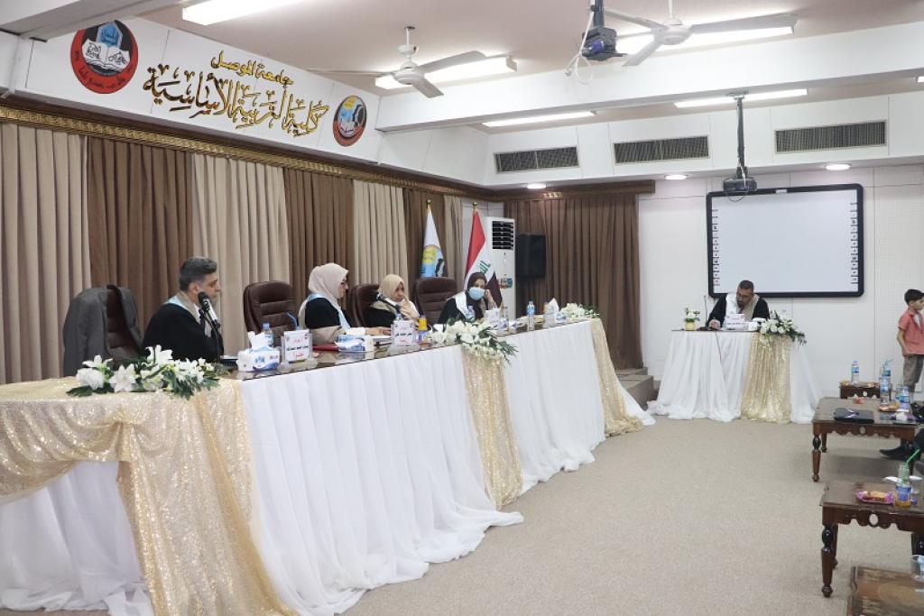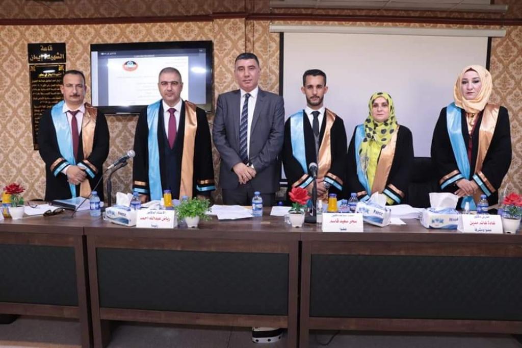 In morning of Thursday 2/9/2021, on Al-Rabeeain hall, department of Arabic in college of Basic Education discussed MA thesis for the student Nazar Madallah Ali. Dean of college attended part of it.