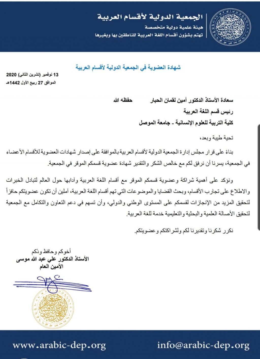 Department of Arabic Language of College of Education for Humanities obtained a certificate of membership to the International Organization for Arabic Language Departments on November 13th, 2020. This membership came as a result of the academic reputation the Department achieved locally and internationally. The objective of the Organization is improving the process of learning and the performance quality of the faculty, which leads eventually to a better output in terms of the needs of the jobs market, the scientific development, and the sustainability.