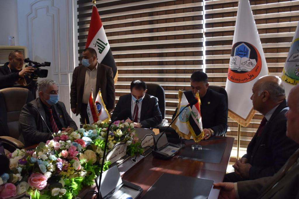 In the line of scientific and academic cooperation, the which Iraqi Ministry of Higher Education and Scientific Research encourages, University of Mosul, represented by Rector Kossay Alahmady and other officials, signed an accord with University of Al-Hamdaniyah in the Scientific and Literary Club of the University, on December 29, 2020.The accord, which aims to extend scientific and academic cooperation between the two universities, included conducting joint projects in the field of scientific research, exchanging visiting scholars, organizing joint conferences and workshops, and organizing joint tests.After signing, the visiting delegation headed by Rector of University of Al-Hamdaniyah, Prof. Dr. Aqeel Al-Araji, and his Assistants for Scientific and Administrative Affairs, besides other officials, paid visits to the reconstruction site of the Central Library of the University, the Students Center, the Direct Book Sale Corner, and to the Book Fair, which the University organizes, in cooperation with local and regional publishers.