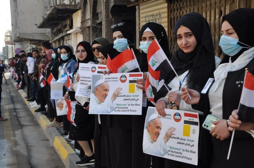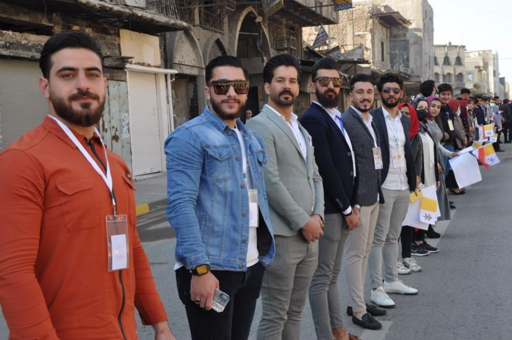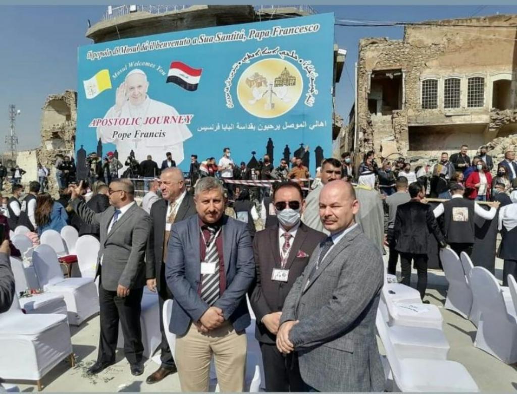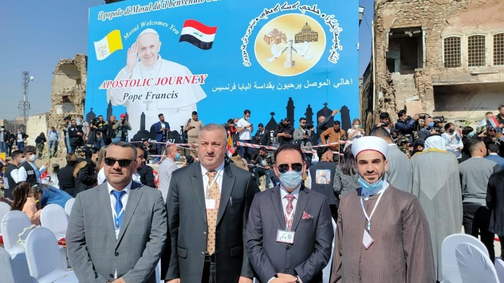 In embodiment of the belief that University of Mosul is a fountain of peace and a living example of coexistence, Rector Kossay Alahmady, staffs, faculty and students of the University participated in the ceremonies of the reception of Pope Francis on Sunday, March 7th, 2021.The celebration of the occasion was held in the attendance of high profile religious, political, public, governmental and non-governmental bodies in the old Church of Howsh al-Bay’a in Old Mosul. Welcoming speeches were delivered in the occasion by officials and public figures as well as a distinguished speech by chief of the churches of Mosul, Abona Ra’ed, through which he related what he experienced, expelled from and returning back to Mosul. Later, Pope Francis held a memorial prayer blessing the people, who lost their lives in the events.