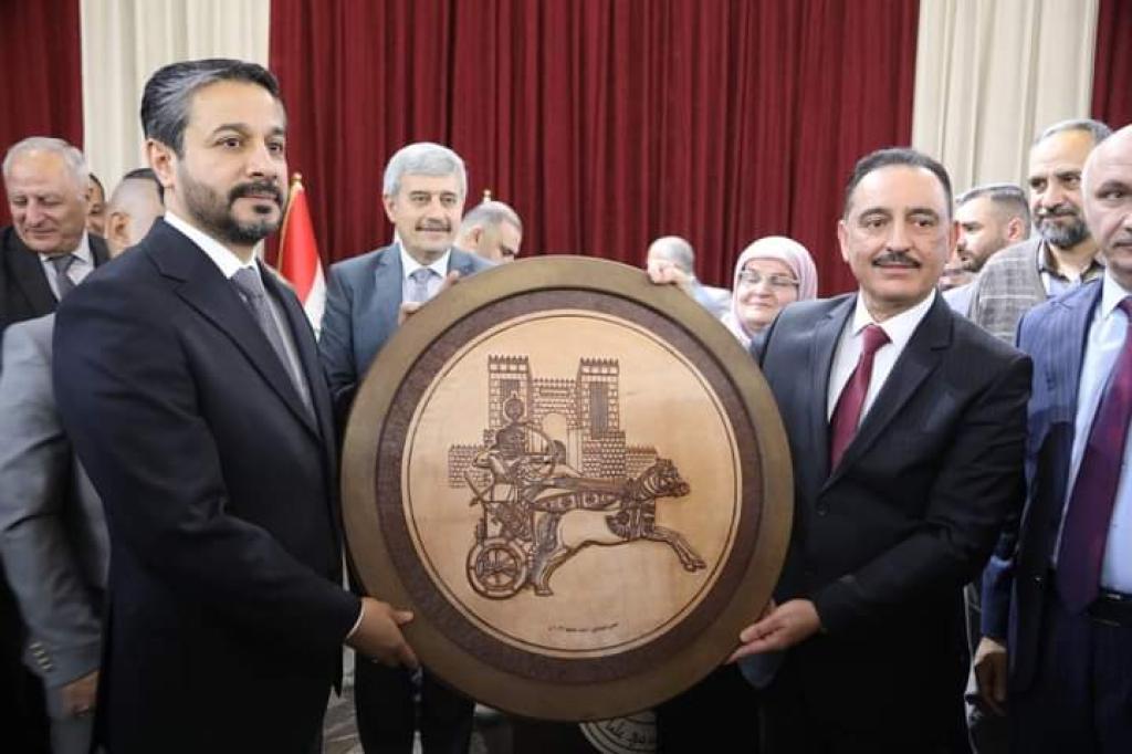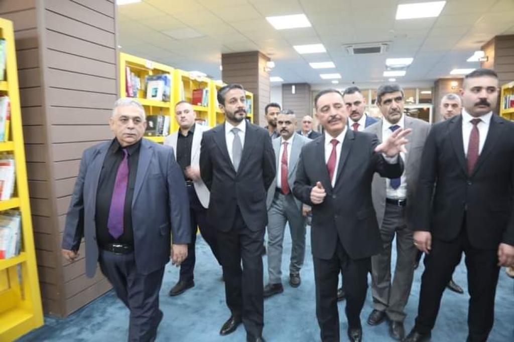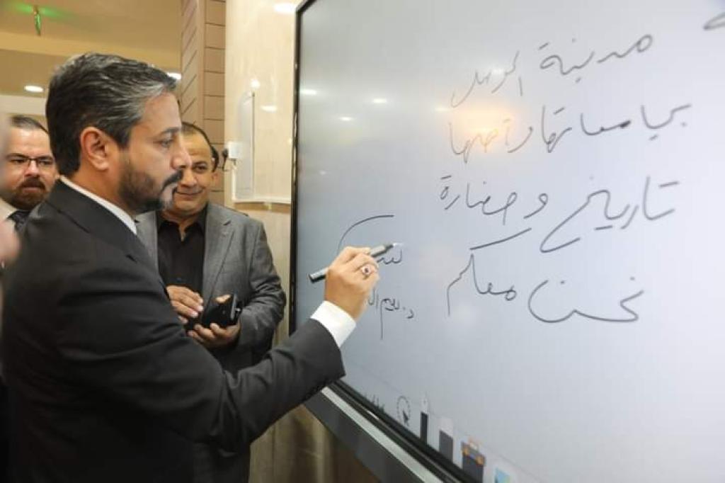 Prof. Dr. Naeem Al-Abboody, Minister of Higher Education and Scientific Research paid a visit to the University within an extended visit to Nineveh universities on November 21st, 2022. The visit is the first for the Minister after his recent assuming of the post. In the visit, he emphasized support to the University saying: “University of Mosul is peculiar to us, and we push to have it re-assuming due stature amid the educational institutions scene.” Then, he added that, “the magnitude of devastation inflicted during the war was huge in the University, and what we see now but proves the tremendous efforts exerted to bring the University back to life and prosperity. ” Later, on the smart board of the Central Library, the Minister wrote: “We stand for you.”The Minister held a meeting with Rector Alahmady and some of the officials and discussed many concerns, pledging to bring them to settlements. On the other hand, he focused on students and recommended that they should be the center of interest, as they are the product of educational institutions, and that future can be seen in and through them.