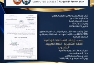 Ministry of Higher Education and Scientific ResearchDepartment of Research and DevelopmentGraduate Studies Section No.: ب ت ه / 7374Date: 29 / 06 / 2025 Subject: Suspension of National Tests Due to the conclusion of the [Read More]