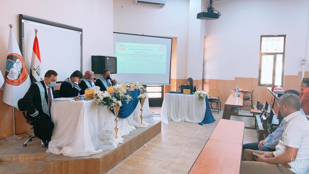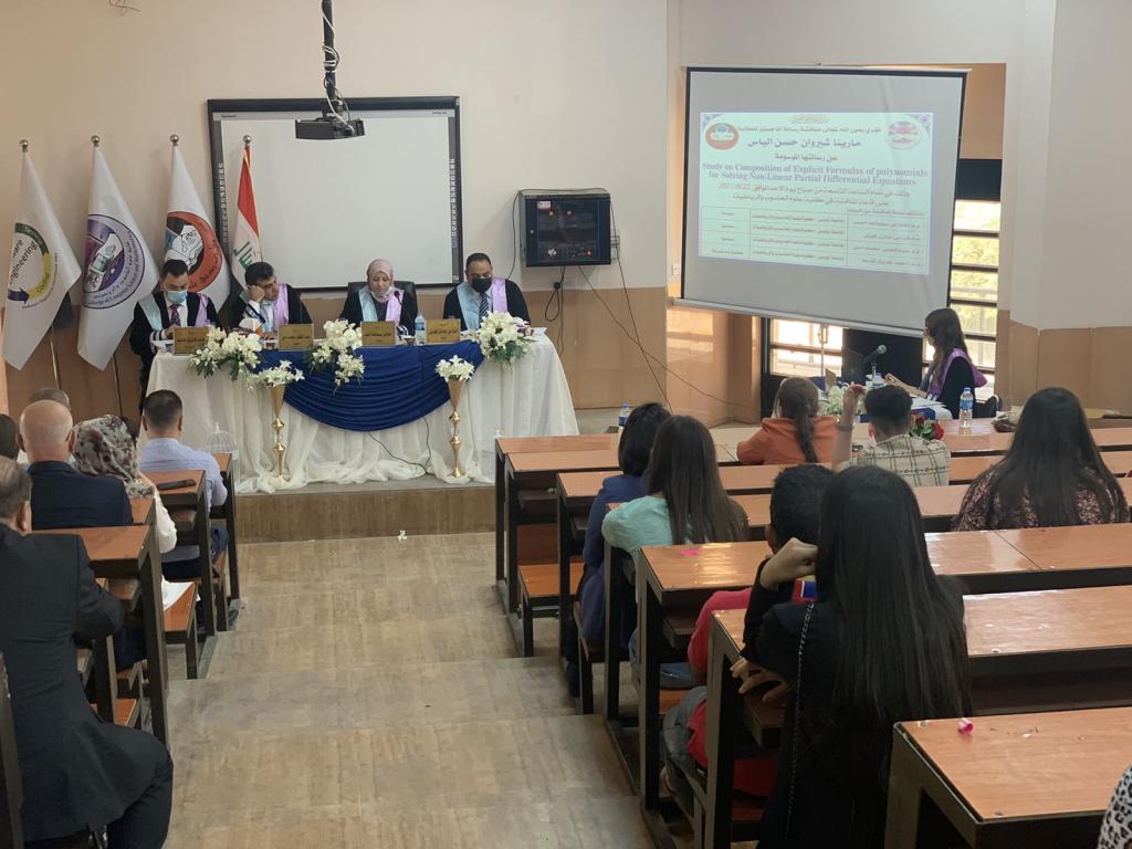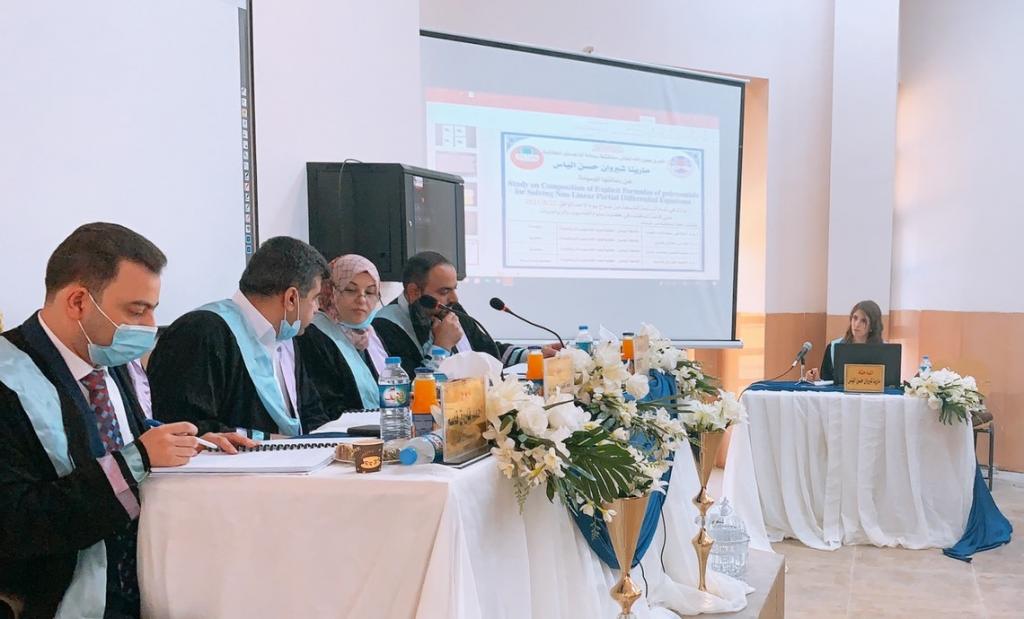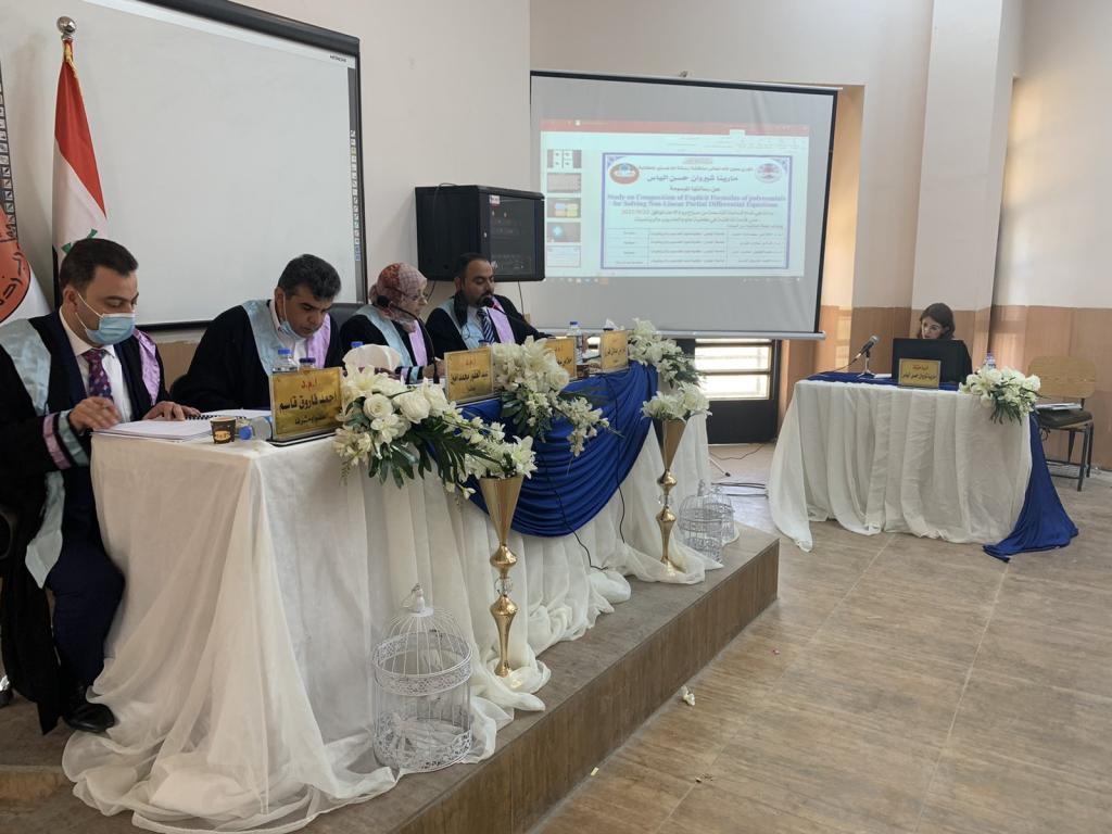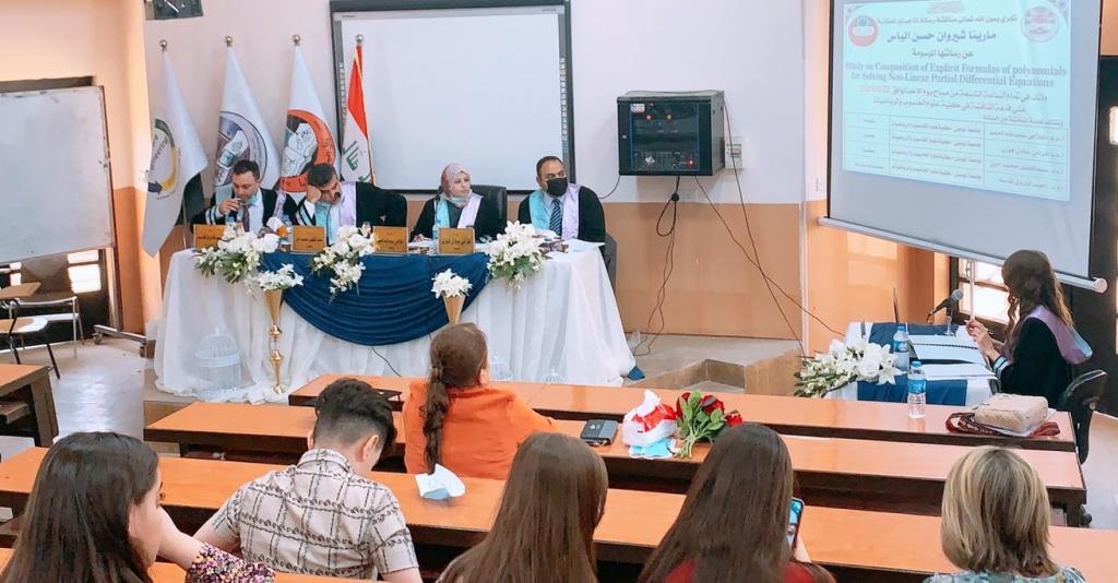Discussion of a master’s dissertation in the College of Computer Science and Mathematics – Department of Mathematics Sciences – on Sunday 08/22/2021The master’s dissertation was discussed in the hall “Dr. Nidhal Al-Asadi”, Faculty of Computer Science and Mathematics, University of Mosul:”A study on the synthesis of explicit forms of polynomials for solving nonlinear partial differential equations”For the student, Marina Shirwan Hassan, under the supervision of the assistant professor, Dr. Ahmed Farouk Qassem.