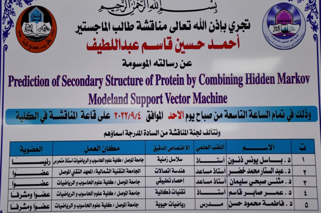 Discussion of a master’s thesis in the Faculty of Computer Science and Mathematics – Department of Mathematics entitled:” Prediction of Secondary Structure of protein by combining hidden Markov model and support vector Machine”It was discussed in the discussion room at the Faculty of Computer Science and Mathematics at the University of Mosul on Sunday 4/9/2022