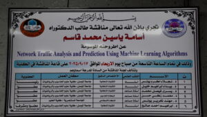 Discussion of a PhD thesis at the College of Computer Science and Mathematics – Department of Computer Science titled: ‘Network Traffic Analysis and Prediction using Machine Learning Algorithms’ continued the movement of scientific research, with the follow-up and presence of the respected Dean of the College of Computer Science and Mathematics, Prof. Dr. Duha Bashir Abdullah. The PhD thesis of the student ‘Osama Yaseen Mohammed’ was discussed in the discussion hall of the College of Computer Science and Mathematics at the University of Mosul on Wednesday, September 17, 2025, under the supervision of Prof. Dr. Ibrahim Ahmad Saleh.