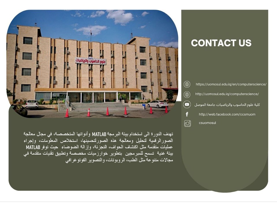 Under the patronage and supervision of the Dean of the College of Computer Science and Mathematics, Professor Dr. Duha Bashir Abdullah, and within the series of scientific activities of the college, the college is holding a series of continuing education courses for the academic year 2025-2026, including a continuing education course “Digital Image Processing Using MATLAB Language” starting from Sunday 9-21-2025. Those who wish to apply for registration