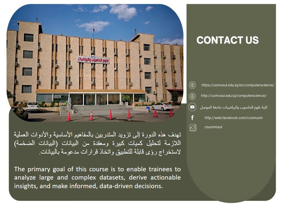 Under the patronage and supervision of the Dean of the College of Computer Science and Mathematics, Prof. Dr. Duha Bashir Abdullah, and as part of the college’s series of scientific activities, the college is holding a series of continuing education courses for the academic year 2025-2026, including a continuing education course “Analytics of Big Data” starting Wednesday 10-1-2025.