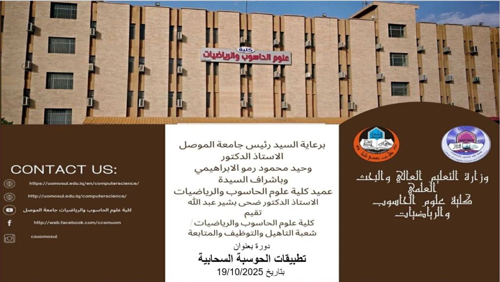 Under the patronage and supervision of the Dean of the College of Computer Science and Mathematics, Professor Dr. Duha Bashir Abdullah, and as part of the college’s series of scientific activities, the college is holding a series of continuing education courses for the academic year 2025-2026, including a continuing education course “Statistical Analysis of Questionnaires Using the Program” starting on Sunday 10-19-2025.