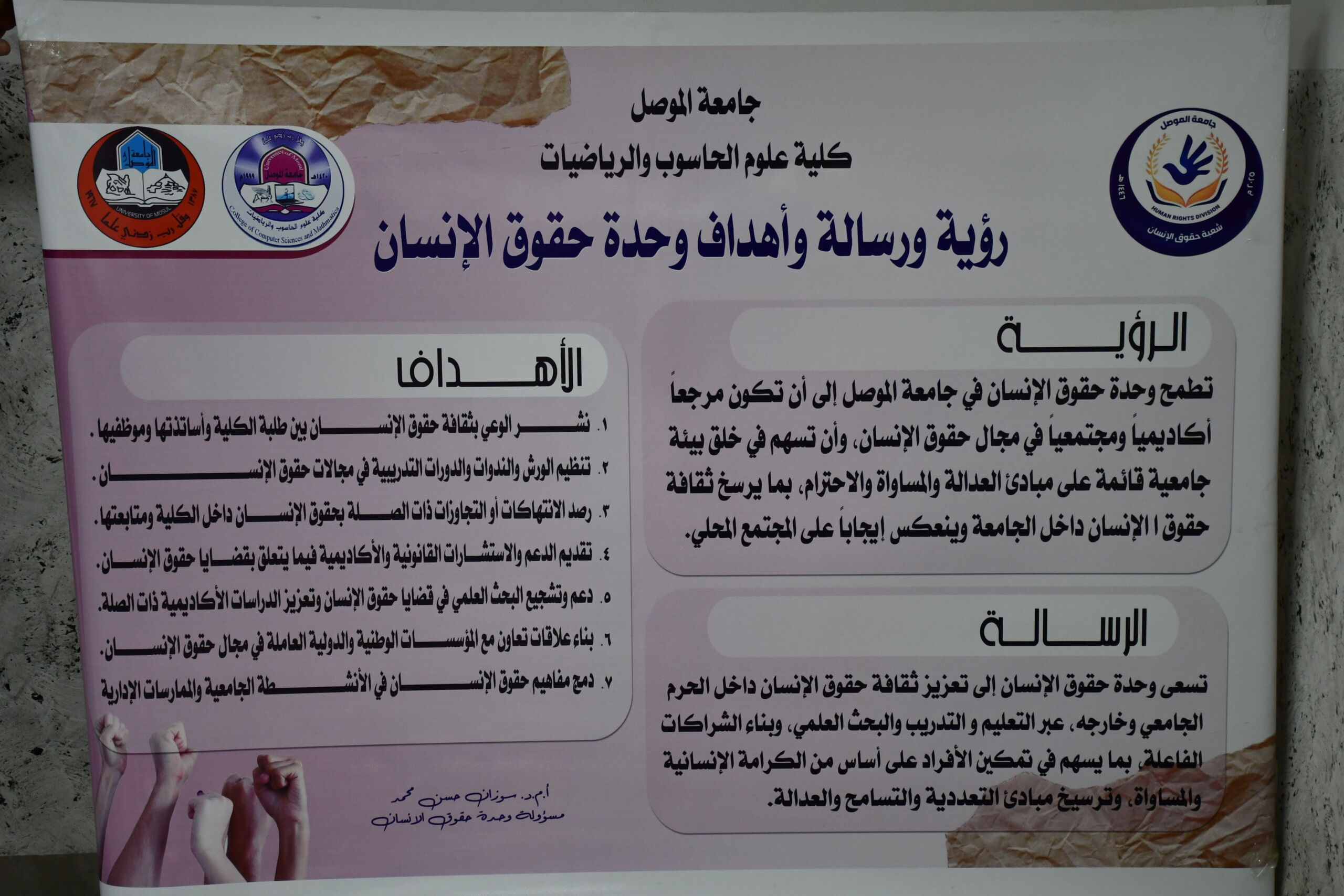 Under the patronage and supervision of the Dean of the College of Computer Science and Mathematics, Professor Dr. Duha Bashir Abdullah, and as part of the college’s series of scientific activities, the College of Computer Science and Mathematics, in cooperation with the Human Rights Division at the University of Mosul, is holding a scientific workshop entitled: “The Role of Artificial Intelligence in Promoting and Protecting Human Rights” on Wednesday, October 29, 2025.