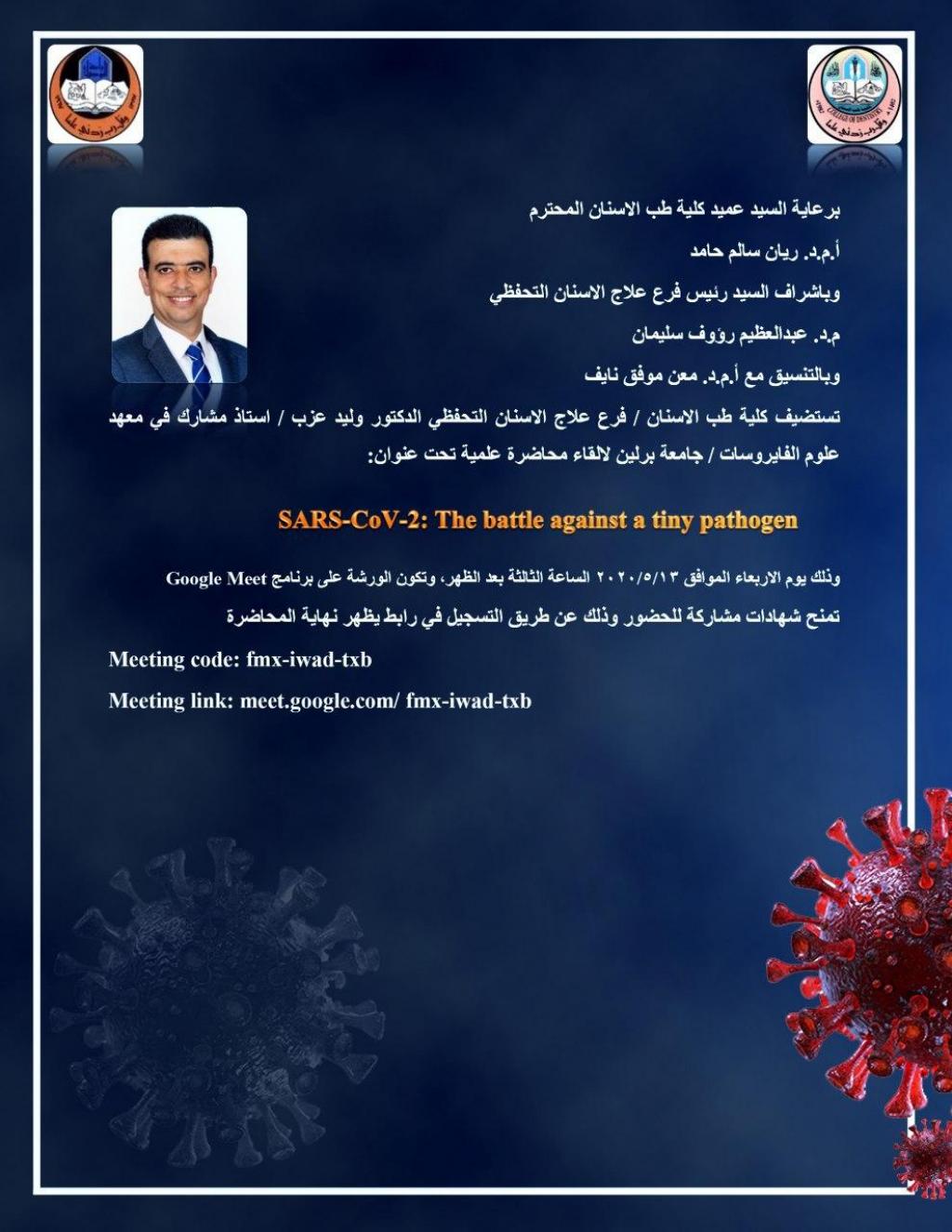 The Faculty of Dentistry / Conservative Dentistry is hosting Dr. Walid Azab / Associate Professor at the Institute of Virology Sciences / University of Berlin to give a scientific lecture titled:
