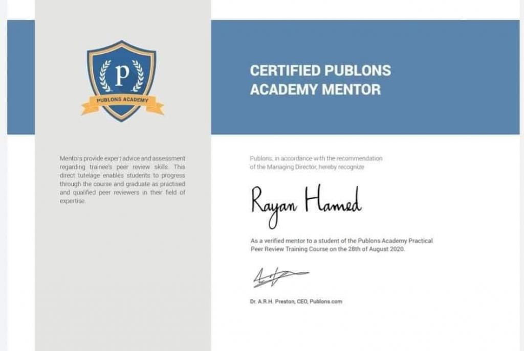 Mr. Dean of the College of Dentistry Dr. Ryan Salem Hamed / PhD in Oral Surgery, holds an international certificate as a trainer from the publons institution concerned with evaluating scientific research submitted for publication in international journals.