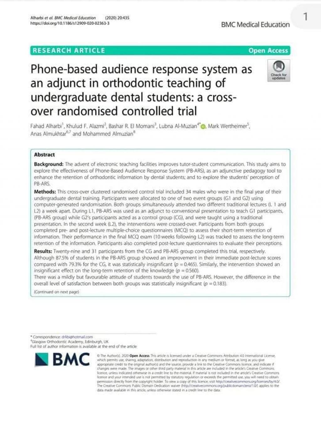 Dr. Anas Muhammad Al-Mukhtar, a lecturer at the College of Dentistry / University of Mosul, participated in a research cooperation that included researchers from the Kingdom of Saudi Arabia, Britain, Australia and other countries, which included an experimental research on one of the newly adopted inclusive e- learning methods, which is a live interactive system during the lecture. The purpose of the study was to explore the effectiveness of a telephone – based audience response system, as an educational method to enhance orthodontic information of dental students. The research was published in one of the most referred international journal in the field of specialization.