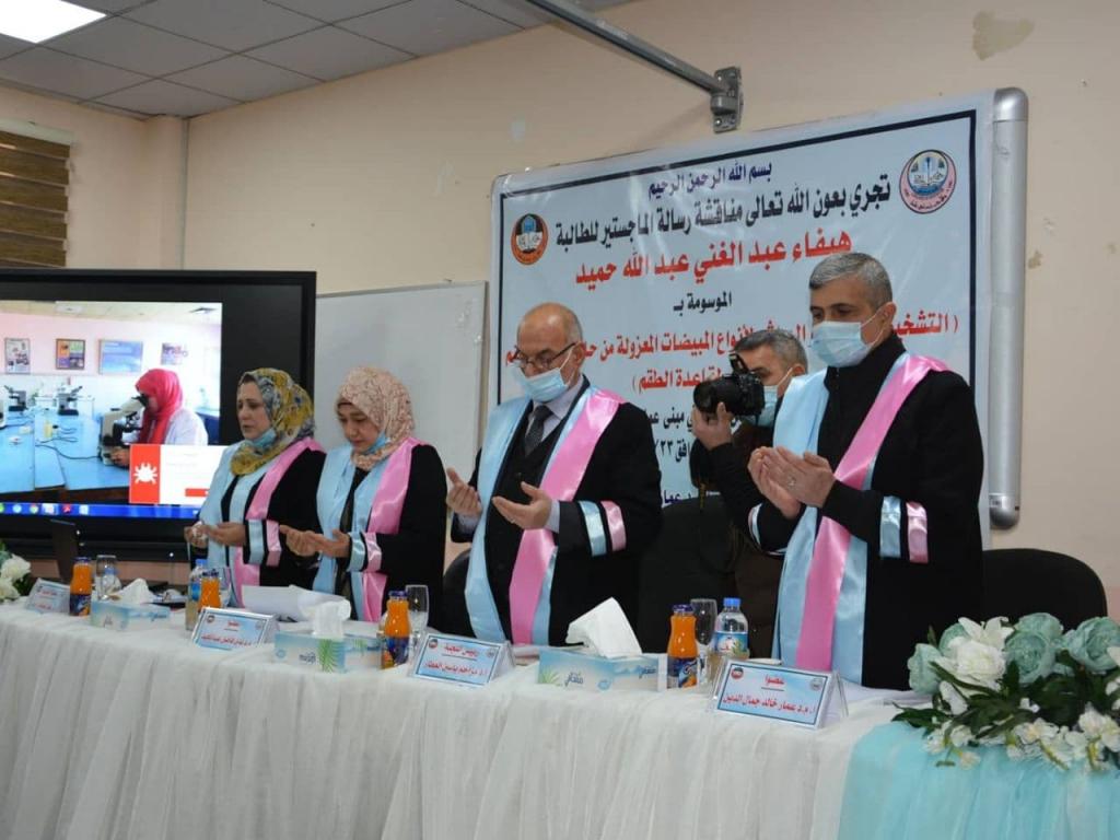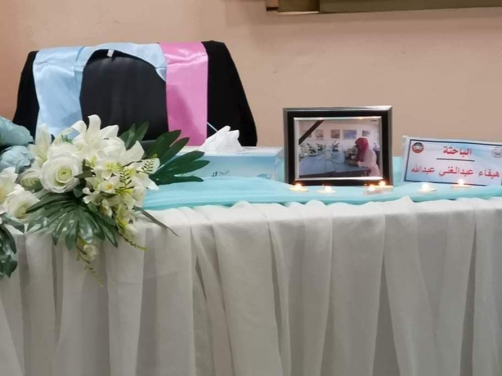 On Wednesday, 12/23/2020, an honorary discussion of MSc thesis by the deceased student (Haifa Abdulghani Abdullah) as a partial requirement for obtaining an MSc degree in oral microbiology was discussed and entitled (Phenotypic and genetic diagnosis of Candida species isolated from stomatitis cases associated with the base of the kit).