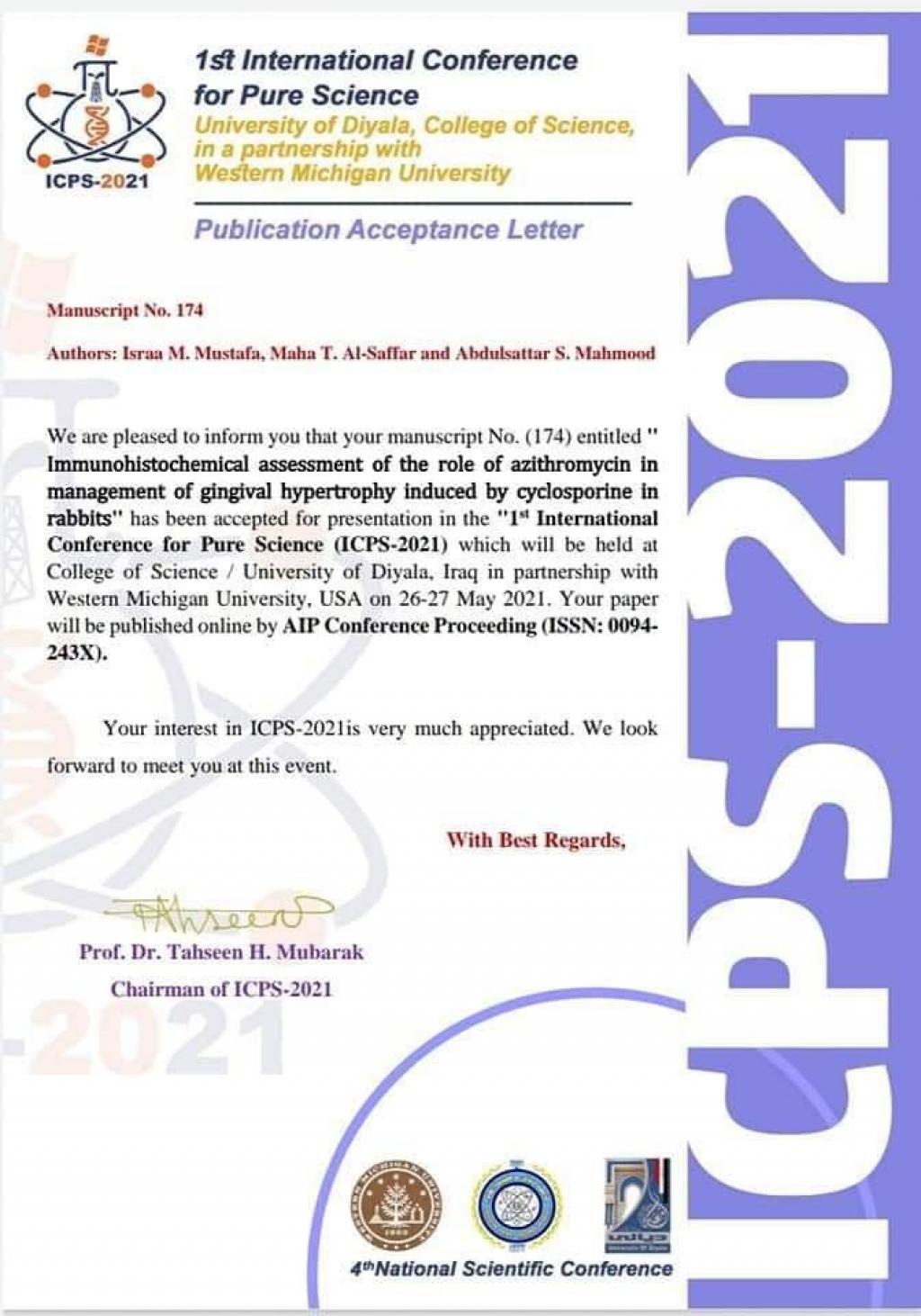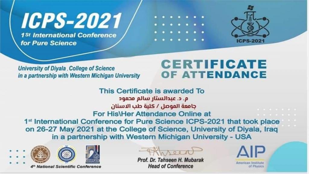 The two faculty members in the College of Dentistry participated in it, they are (Dr. Maha Talal Al-Saffar) from the Basic Dental Sciences Department and Dr. (Abdul Sattar Salem Mahmoud) from the Oral and Maxillofacial Surgery Department with a master’s student in pharmacy (Esraa Mahmoud) at the Diyala International Conference in cooperation with the American University of Michigan, which was held on May 27, 2021 with the research entitled