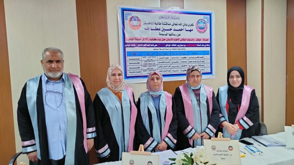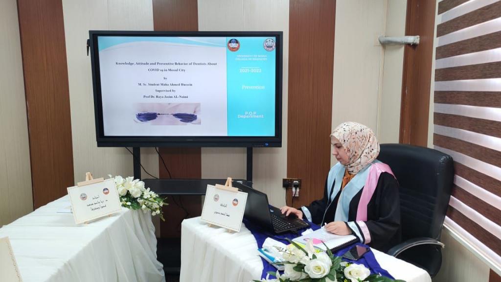 College of Dentistry discussed M.Sc. Thesis entitled “Knowledge, Attitude and Preventive Behavior of Dentists about COVID19 in Mosul City” on 26 April 2022 forwarded by Maha Ahmad Hussein. The study evaluated the effect of Knowledge, attitude and preventive behavior of dentists which disclosed that the infection preventive behaviors of dentists had no clear vision about the influence of the age, gender, qualifications, practical experience and job position. More educational programs related to infection prevention and how to treat COVID19 patients must be focused on.