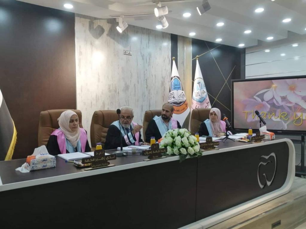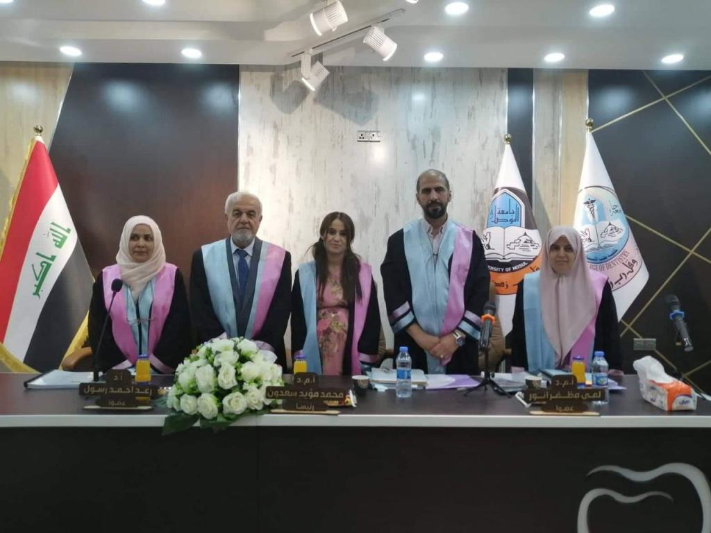 The examination Committee was chaired by Assist. Prof. Dr. Mohammed Moayed Saadoon / College of Dentistry/ University of Mosul and with the membership of Assist. Prof. Dr. Luma Mudhafar Anwar / College of Dentistry/ University of Mosul and Prof. Dr. Raad Ahmed Rasul / College of Education for Pure Science/ University of Mosul and with supervision and membership of Assist. Prof. Dr. Nada Zuhair Mohammed/ College of Dentistry/ University of Mosul.