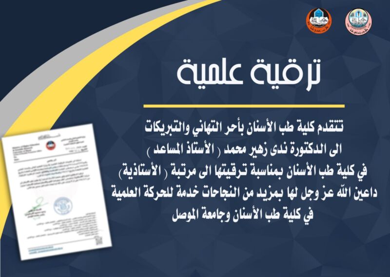 mohamadaljalily2025-11-28T16:22:58+00:00The Deanship of the College of Dentistry extends its warmest congratulations to Dr. Nada Zuher Mohammed, a faculty member at the Department of Prosthodontics, on her promotion to the rank of Professor We congratulate her on this scientific achievement and wish her continued success and productivity “Achieved targets of the Sustainable Development Goals: Goal 4.”