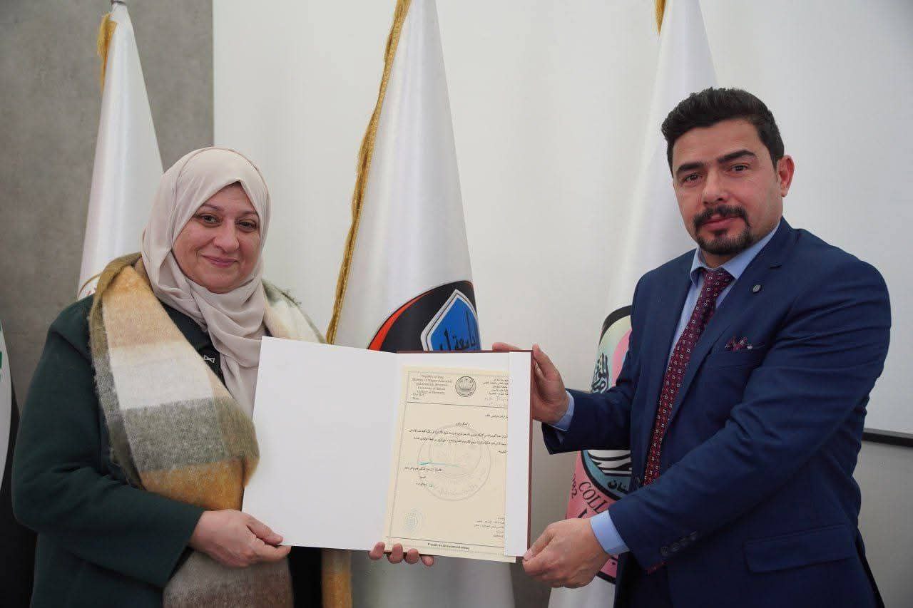 The book was formally handed over during an official meeting that brought together the author and the Dean of the College of Dentistry, Assistant Professor Dr. Neam Riyadh Saleem, who expressed her sincere appreciation and gratitude for this valuable initiative. She emphasized the importance of enriching the college library with well-established academic publications that contribute to broadening knowledge horizons and enhancing legal and humanitarian culture alongside medical specializations for all beneficiaries.