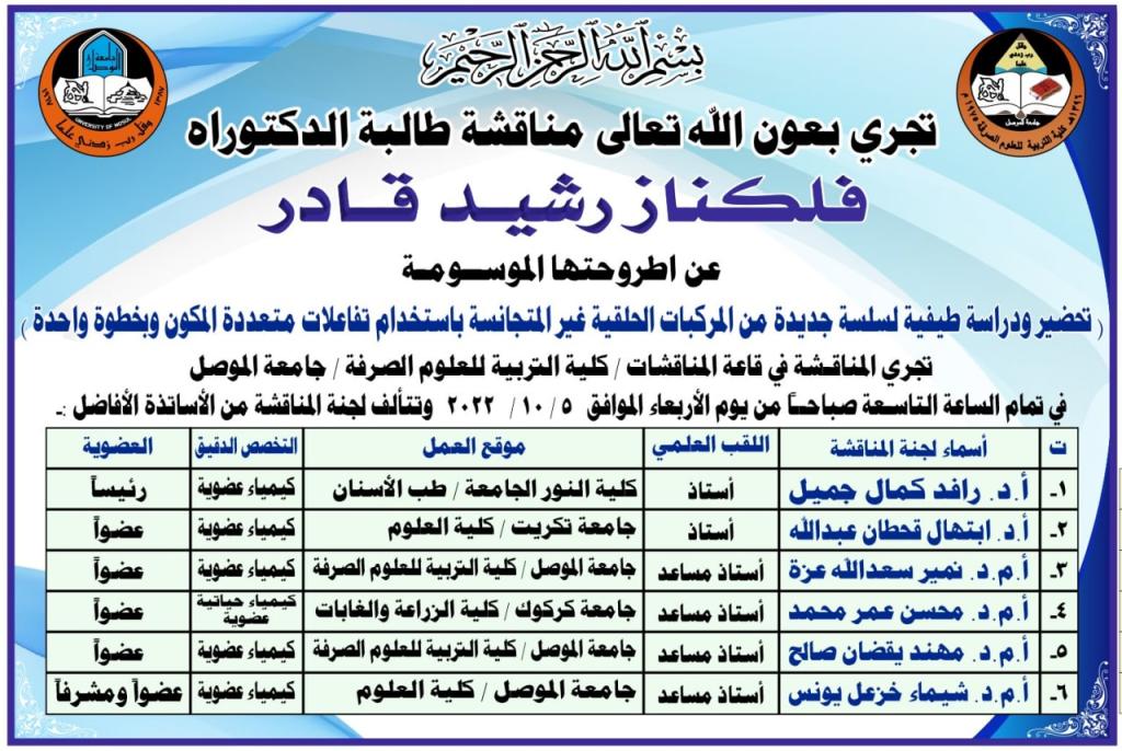 PH.D. Dissertation Viva in the College of Education for Pure Science entitled ” Preparation and spectral study of a new series of heterocyclic
