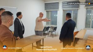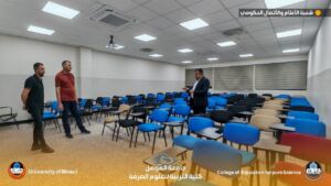 This evening, The Dean of the College of Education for Pure Science, Assistant Professor Dr. Jassim Fatehi Ali, accompanied by the Administrative Assistant, Assistant Professor Dr. Younis Saadi Saeed, and the heads of the academic departments, inspected the exams halls to check the college’s preparations, the logistical readiness of the exams halls, the available supplies, and the requirements for the start of the final exams which are going to start tomorrow on Sunday, April 27, 2025. This visit is to serve the educational process. The Dean Dr. Ali is wishing all students continued success and excellence.