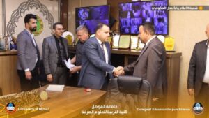 As part of the communication between the General Directorate of Education in Nineveh and the College of Education for Pure Sciences, the Dean of the College of Education for Pure Sciences, Assistant Professor Dr. Jasim Fathi Ali, accompanied by the Assistant Dean for Academic Affairs, Professor Dr. Yasser Yahya Qasim, and the Head of the Quality Assurance Division, Professor Dr. Yasser Shakib Muhammad, visited the General Directorate of Education in Nineveh on Sunday, May 4, 2025. During this visit, they met with the Director General of the Directorate, Mr. Muhammad Ibrahim Aboudi.