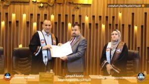 The Dean of the College presented a letter of thanks and appreciation to Professor Dr. Najm Abdul-Zahra Mukhrab from the College of Science at Al-Mustansiriya University for his travel and participation in the student’s discussion.