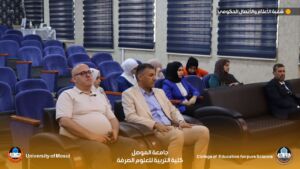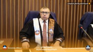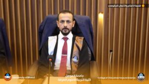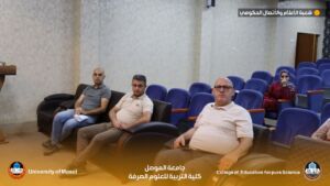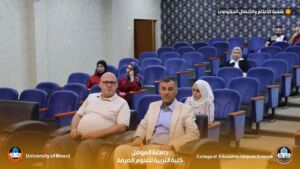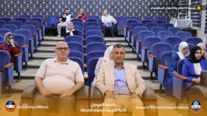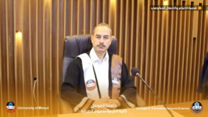 Part of the thesis defense was attended by the Assistant Dean for Administrative Affairs, Assistant Professor Dr. Younis Saadi Saeed, the Head of the Chemistry Department, Assistant Professor Dr. Omar Thanoon Ali, and a number of faculty members from the department.