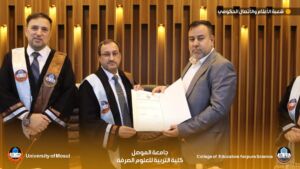 The discussion committee was chaired by Professor Dr. Yousef Jabbar Ismail, and Professor Dr. Hussein Saber Muhammad Ali, Professor Dr. Abl Ahmed Hasan Erdini, Assistant Professor Dr. Yusra Majeed Shihab, and Assistant Professor Dr. Muhammad Hazim Sabry as members, and Professor Dr. Abdul-Aziz Younis Al-Safawi and Assistant Professor Dr. Mira Osama Al-Kateb as both members and supervisors. The Dean of the College presented a letter of thanks and appreciation to Professor Dr. Abd Ahmed Hasan Erdini from the College of Education for Women at Tikrit University and Assistant Professor Dr. Yusra Majeed Shihab from the College of Environmental Sciences and Technologies at Mosul University for their participation in the dissertation discussion of the researcher.