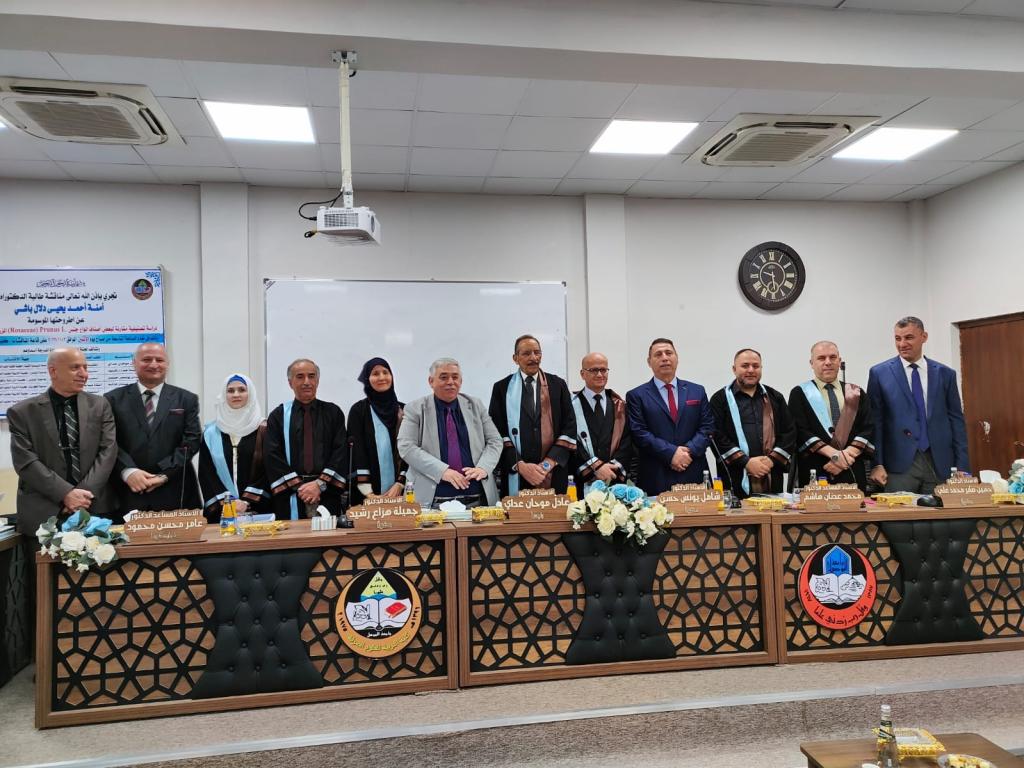 PH.D. Dissertation Viva in the College of Education for Pure Science entitled ” A taxonomic study of some species of the genus (Rosaceae) Prunus L. Cultivated in Northern Iraq “The College of Education for Pure Science, University of Mosul, has done the PH.D. Dissertation Viva entitled ” A taxonomic study of some species of the genus (Rosaceae) Prunus L. Cultivated in Northern Iraq “,On Monday, November 7, 2022, the respected Dean of the College, Assistant Professor Dr. Qais Ismail Ibrahim, the Honorable Scientific Associate and Administrative Associate, the Honorable Head of the Department of Biology, and a number of the college’s teachers were attended the viva. The current study, presented by the PH.D. Student Amina Ahmed Yahya Dalal Bashi in the Department of Biology, dealt with the taxonomic traits which are Morphology, Anatomical and Genetic Numerical for (6) cultivars of apricots Prunus armeniaca L. she Sayeb, Canion, Castelbrite, Priana, Sndyany, Zaginia. In addition to (6) cultivars of Plum Prunus xdomestica L. Songold, Freedom, Showtime, pissardi, Italica, Sant Rosa (part of the Rosaceae family). All these cultivars grown in a cultured manner in different regions of northern Iraq, including Dohuk (Zakho and Zawitya), Erbil (Hiran district) and Mosul. The Morphological study included the characters (the nature of the plant, stems, twigs, buds, stipules, leaves and their peduncles, flowers, including the Perianth and reproductive organs, fruits and seeds, as well as their indumentum. The floral and fruiting characteristics were more stable than others, whereas, the stems, buds, leaves and Stipules showed a great difference in their dimensions, shapes, and their forms in different cultivars, which had a good taxonomic importance in isolating and diagnosing the cultivars of the two studied species. The pollen grains study also showed it is of the tricolporate type, and according to its shape in the studied cultivars, it appeared in the equatorial view, spherical, subspherical, or ovate. In the polar view, their shapes were spherical-triangular, triangular, or Triangula-Tetrangular. Whereas for the surface ornamentation of pollen grains when examined with a Scanning Electron Microscope (SEM), it was reticulate in the cultivar Sndyany for the type P. armeniaca or granular in Castelbrite, Priana for P. armeniaca or striped in Canion for P. armeniaca and the cultivars Songold, Freedom, pissardi, Italica of the plum species P. xdomestica or granular and striped as in cultivars Sayeb, Zaginia for P. armeniaca and Showtime, Sant Rosa for P. xdomestica . On the anatomical side, the characteristics of the epidermis were studied in terms of the nature of the cell walls on the upper and lower surfaces, and the stomatal complex, which was of the anomocytic type, and its leaves, which were of the Hypostomatic type, as the presence of stomata was limited to of the Abaxial surface blade and their absence on the Adaxial surface in all the cultivars of the two types studied, The leaf veining system is a Pinnate reticulum of the type Brochidodromous in apricot cultivars and Craspedromous in plum cultivars. Moreover, the cross-sections of the leaf stalk, its blade, its middle vein, and the number of layers of epithelial and spongy tissue As well as the crystals and their Indumentum and the wood elements of the branches, as the study of these parts had a taxonomic importance in isolating the cultivars and supporting the studied Morphology characters. For genetic markers, they included estimation of genetic similarity and dimension between the studied cultivars using Rapid Amplification Polymorphic DNA (RAPD) technology , in which DNA fragments were multiplied and amplified during Polymerase Chain Reaction (PCR) using 13 random primers which yielded (1038) random bundle, some of which were distinct (unique and absent) and the other part was different, as the OPF-20 initiator produced the highest number of bundles, which amounted to (118) bundles, and the highest efficiency amounted to (11.37), and the lowest number of bundles was shown by the initiator OPA-19, which amounted to (51) bundles and the least efficiency His (4.91), and the statistical analysis using the NTSYS-PC program showed that the value of the genetic dimension between these varieties ranged between (0.065-0.887), Since the highest value was found between the two cultivars Showtime and pissardi for P. xdomestica it reached (0.887), and the lowest value was found between the two cultivars Priana and Sndyany for P. armeniaca, which amounted to (0.065). The genetic similarity between the studied cultivars ranged between (0.937 – 0.412), the highest value found between the two cultivars Priana and Sndyany for P. armeniaca its value was (0.937), and the lowest value found between the two cultivars Showtime and pissardi for P. xdomestica reached (0.412). Through the dendrogram cluster, it was possible to divide the studied cultivars into two main groups, the first included all the Apricot cultivars P. armeniaca, which was divided into two secondary groups based on the degree of genetic similarity. The first included Canion, Castelbrite, Priana, Sndyany, Zaginia Which in turn was divided into two secondary groups, and the second included the cultivar Sayeb, and the second main group included all the pear cultivars P. xdomestica, which was divided into two secondary groups also according to the degree of similarity between the cultivars. The first included the cultivars Songold, pissardi, Italica, and the second included the cultivars, pissardi, Italica , Saint Rosa. On the numerical side, some Morphological and anatomical characteristics were analyzed numerically to clarify the relationship between the two types apricot P. armeniaca L and plum P. xdomestica by Dendrogram and Polygonal graphs.The Viva committee was chaired by Prof. Dr. Adel Mohan Aday / Sulaymaniyah Technical University/Technical College of Applied Sciences and the