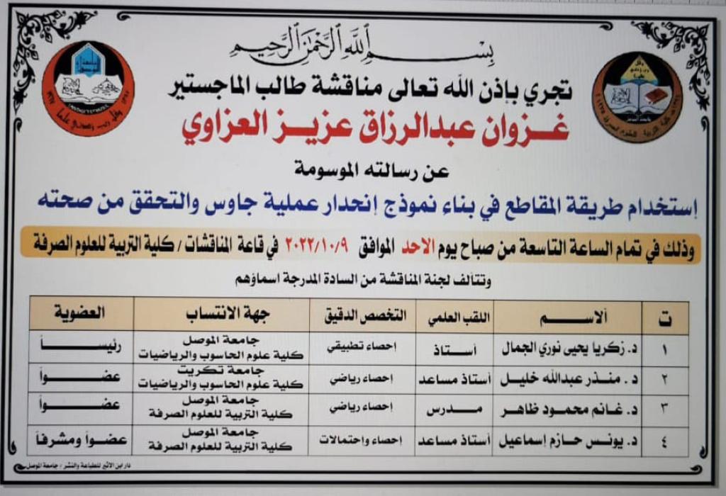 Master Thesis Viva in the College of Education for Pure Science entitled ” Cross-Validation Method for Building and Validating Gaussian Process Regression “The College of Education for Pure Science, University of Mosul, has done the Master Thesis Viva entitled ” Cross-Validation Method for Building and Validating Gaussian Process Regression “,On Sunday, October 9, 2022, the College staff including the respected Dean of the College, Assistant Professor Dr. Qais Ismail Ibrahim, the Honorable Scientific Associate and Administrative Associate, the Honorable Head of the Department of Mathematics, and a number of the college’s teachers were attended the viva. This study, presented by the Master student Ghazwan Abdurazzaq Azeez Al-Azzawi in the Department of Mathematics, presents constructing a GPR and estimating the correlation parameters using the cross-validation method, as well as several measures are presented for testing the validity and efficiency of the GPR. These measures are based on comparisons between GPR predictions and outputs of the computer model. Furthermore, we compared the cross-validation (CV) method with the maximum likelihood (ML) and we discovered that the results are quite comparable between the two approaches, therefore CV may be regarded as an alternative to the ML method.In this thesis, two types of examples were taken, the first is simple one-dimensional, and the other is from real-world systems, which is the wing weight function, and all the calculations and figures were done using the (R) program.The Viva committee was chaired by Prof. Dr. Zakarya Yahya Aljammal from University of Mosul/ College of Computer Sciences and Mathematics and the membership of Asst. Prof. Dr. Munther Abdullah Khalil, University of Tiktit, College of Computer Science and Mathematics, Lecturer Dr. Ghanem Mahmood Dhaher, University of Mosul, College of Education for Pure Sciences and under the supervision and membership of Asst. Prof. Dr. Younus Hazim Ismael, University of Mosul, College of Education for Pure Sciences.